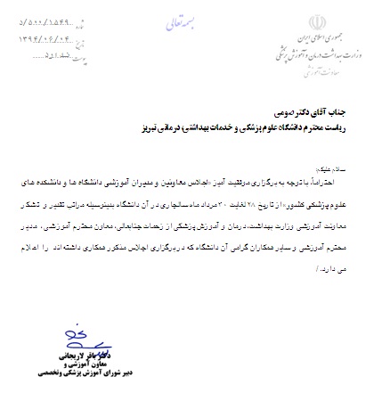تقدیر و تشکر معاون آموزشی و دبیر شورای آموزش پزشکی و تخصصی وزارت جناب آقای دکتر باقر لاریجانی به جهت برگزاری موفقیت آمیز اجلاس معاونین و مدیران آموزشی دانشگاهها و دانشکده های علوم پزشکی کشور در تبریز